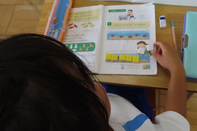 「たしざん」の学習です。「あわせて」「みんなで」「ぜんぶで」「あわせると」などなど。「たしざん」のキーワードがどんどん増えていきます。今日は「ふえると」がその仲間入りをしました。ブロックを使って考えていました。「このあと」ひき算の学習も同じように続いていきます。