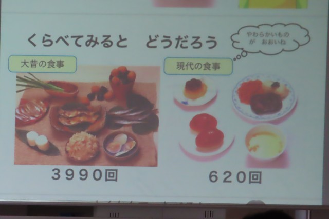 給食の時間、給食センターより栄養士さんに4年生の教室で大切なお話をしていただきました。「よくかんで食べよう」です。よく噛んで食べることと健康な体との関係について、とても分かりやすく教えていただきました。自分の大切な体をいつまでも健康に維持するために、しっかり実践してほしいです。