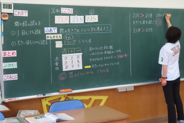 「100より大きい数」の学習です。今日は数の大きさの比べ方を考えていました。「数の線を読むときとおなじだね!」気付きました。そして新しいことも知りました。数の大小の表し方(不等号)について先生から教えてもらいました。2年生はいつでも新しいことを学ぶとき、「なんだろう?」と早く知りたいきもちになります。(4枚目の写真)。そして早く使ってみたい!「やる気いっぱい」になります。