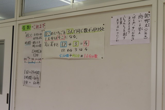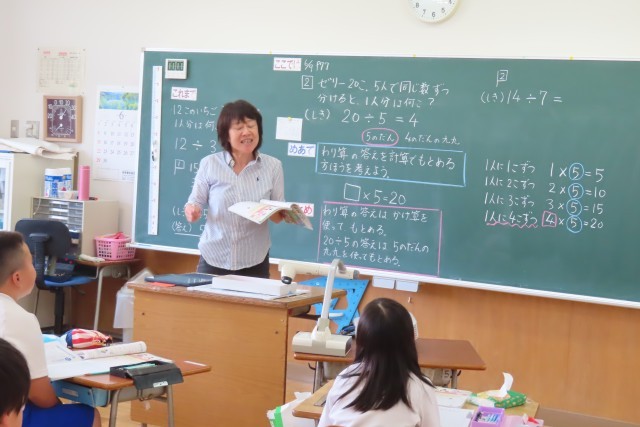 「わり算」の学習が始まって、今日はわり算の答えを計算で求める方法を考えました。だんだんと考え始めるなかで、「かけ算をつかえばいいんだよ」と声があがりました。これまで一生懸命頑張って学んだかけ算と、ここで新しく学ぶわり算はつながっていることが分かりました。算数の学習はこうしてずっとつながっているから一つ一つの学習をしっかり身に付けておかなければいけないことを十分に感じて力を付けてほしいです。