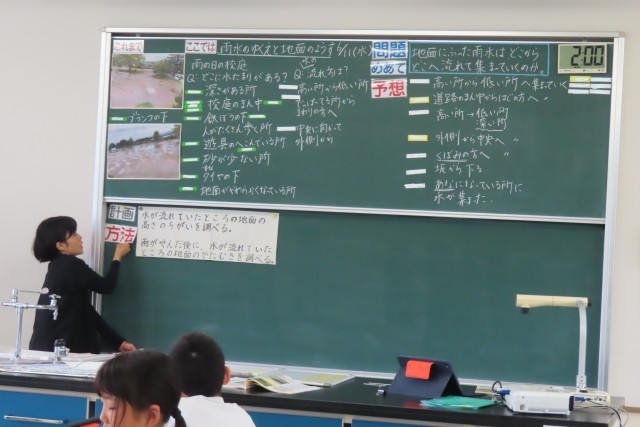 (写真上)雨や校庭の様子が気になります。「雨水のゆくえと地面の様子」を学習しています。ここでの問いは、地面に降った雨水の流れ方についてです。予想をたてたあと、いよいよ観察になるのですが・・・やはり気になる天気状況です。昨日、梅雨入りしました。外でおもいっきり遊べないのでちょっと残念ですが、理科の学習は充実するでしょうか?!「ここでは」雨水の行方が地面の様子に関わりがあることを知ります。そして、雨や川など、この自然における水の様子にも関心を高め、防災、安全のことにまでつなげて考えられるような学習をします。