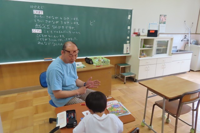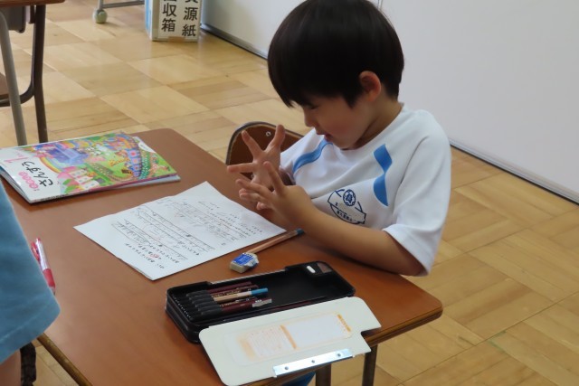 4時間目に1年生が算数を学習していました。今日の問題は、「えをみて、4+3のしきになるもんだいを つくりましょう」です。ちょっと難しい、問題でしたが、ワークシートには頑張ってたくさん考えたあとが残っています。先生と対話しながら楽しそうに「できた!」「わかった!」を味わって学んでいます。