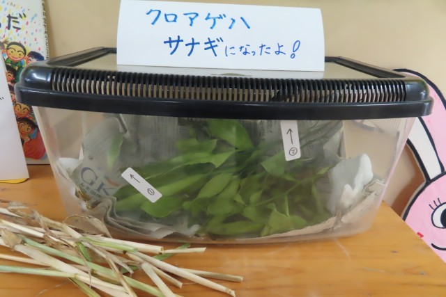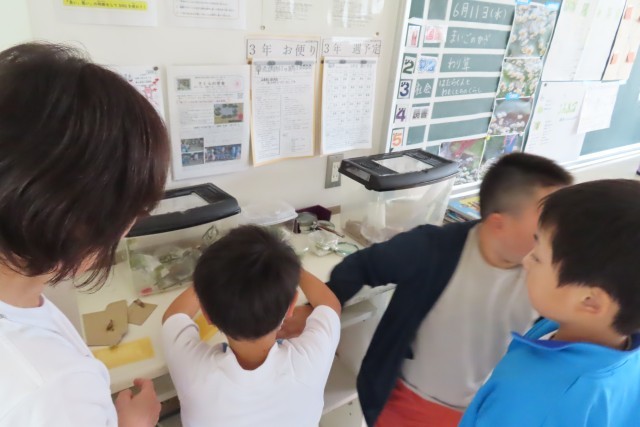 (写真1~3枚目)3年生の教室です。卵から育てているクロアゲハ。すでに飛び立っていった子もいますが、今日あらたにきれいな成虫になった子がいました。今日は雨が降っているので明日外にはなしてあげようということになり、3年生は脱脂綿に砂糖水をしめらせて、すぐそばにおいてあげました。さらに、もうすぐ脱皮しそうな子もいます。明日学校に来るのが楽しみです。