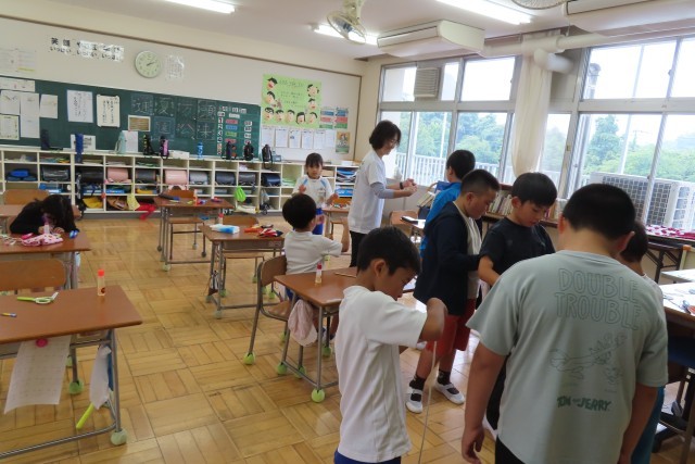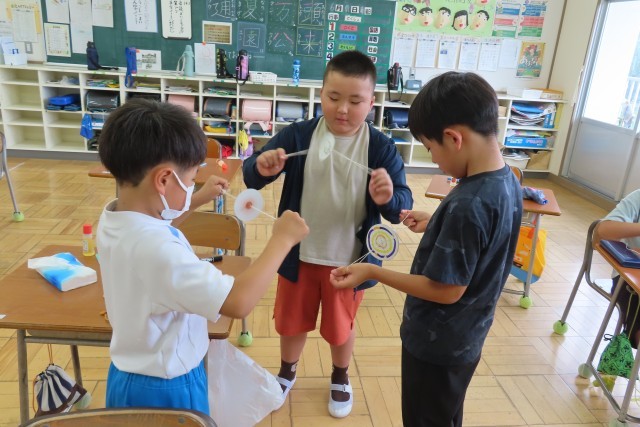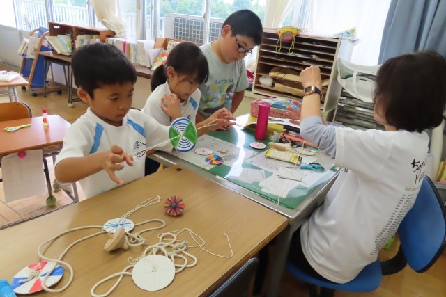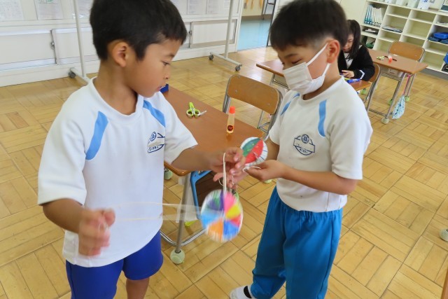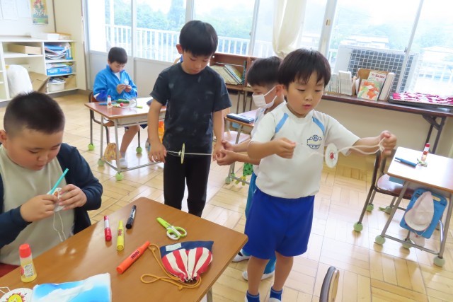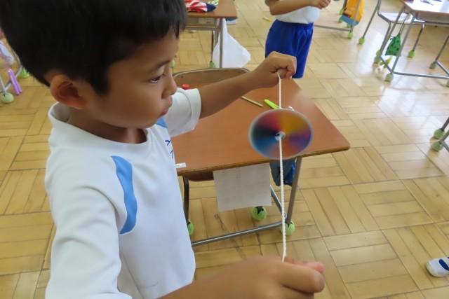 「びゅんびゅんごま」をつくって遊んでいました。色やデザインを考えて塗ると、まわしたときに「おもしろいな」「きれいだな」と声があがります。ひもを通したり、厚紙を切ったりするのは大変だけど、まわったときは嬉しそうです。昔からの遊びのおもちゃです。なかなか最初はうまくまわりませんが、何度も何度もまわしてみたり、友達の動きを見てまねしてみたりして、みんな上手にまわせるようになりました。