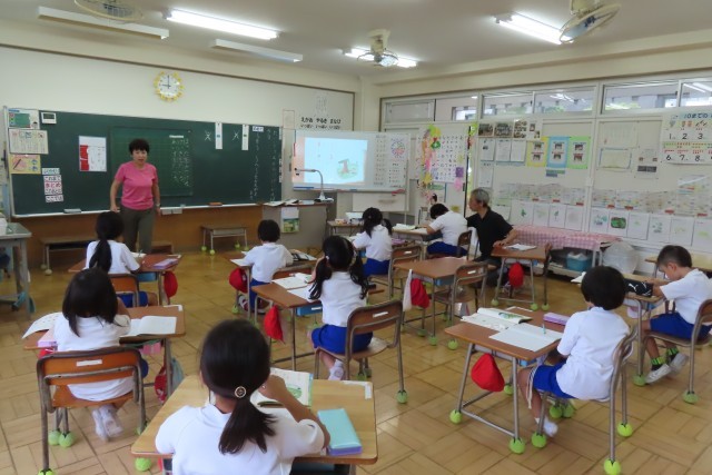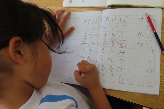 先生がたくさんほめていました(感激していました)。「1年生、どんどん文が上手につくれるようになっています!」「ノートに書くのも上手になっています!」どんどんいろいろなことができるようになっている1年生。今日は「を」の使い方です。「を」を使った文章がどんどん出てきます。自分の生活の中でよく話している文章を頭の中から取りだして答えています。みんなの考えた文がどんどん黒板やノートに書かれていきました。