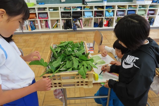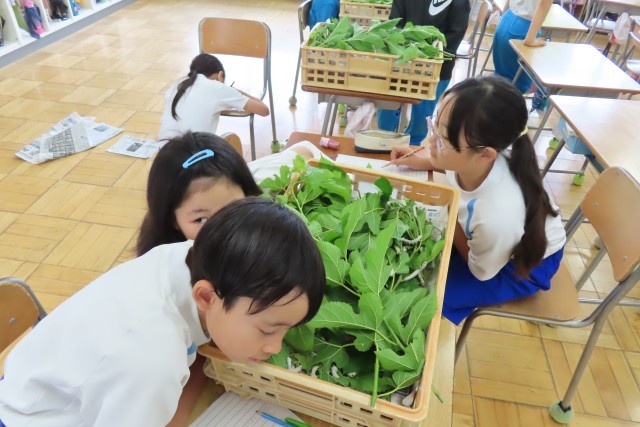 毎日毎日、大切に愛情を注いで育てているカイコの成長には驚きです。土日に会えなかったので今朝カイコに会うのを楽しみにして登校した児童もいました。金曜日とは別のカイコなのでは?と思うほどの成長のはやさに、観察記録のカイコ日記には残しておきたいことがたくさんです。そしてみんなで耳をすませて、カイコが桑の葉を食べる音がきこえてきました。土日に持ち帰って世話をしてくれた児童とそのご家族、ありがとうございました。また、地域で桑の葉を提供してくださっている方がいらっしゃり、あらためて感謝の気持ちいっぱいです。