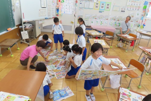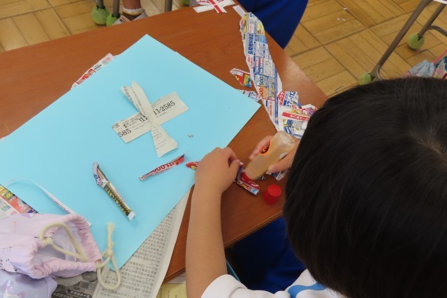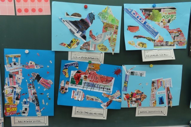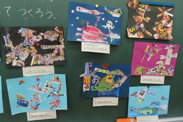 「やぶいたかたちから うまれたよ」大好きな図工の時間です。「ここでは」紙(学校では広告の紙使用)をそっとやぶいて生まれた形や色から、なにがみえてくるか?想像して作品をつくります。最初は先生や先輩(去年チャレンジウィークで体験した東中の生徒)の作品を見せてもらって、ワクワクしはじめていました。偶然にうまれた形ですが、「さかなにみえる!」「ちょうちょみたい!」「たこさんだ!」どんどん想像がふくらんできて、個性豊かな楽しい作品が仕上がりました。写真でお楽しみください。