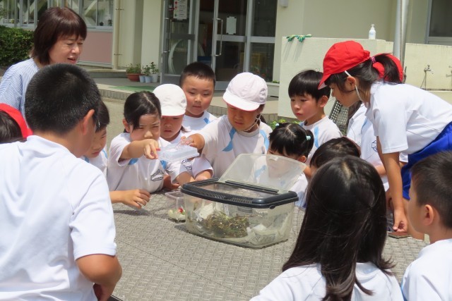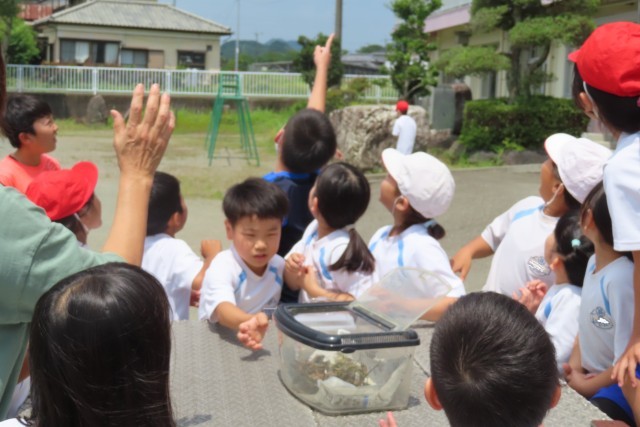 昨日に引き続き、地域の方からいただいた大切なクロアゲハチョウを空にかえしてあげました。みんなで「バイバイ!」と見送りました。また3年生がずっと育ててきたモンシロチョウもふ化したので一緒に外に連れていってあげました。でも、モンシロチョウはうまく飛ぶことができず、しばらく校庭で頑張っていました。児童が近くに花をもっていってあげたり声をかけてあげたりすると、元気が出たようで、また飛び始めました。美九里西小の子供たちはとっても優しいんです♪