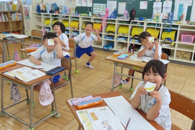 先生からバナナ(カード)をもらってムシャムシャ大喜びで食べている児童がいました。今日の問題は「ばななが10ぽんありました。4ほんたべました。のこりは なんぼんですか?」です。「ここでは」ひきざんの意味をよく理解して、食べたら、のこりは、あげると・・・などは「ひきざん」ということを理解しています。さあ、今度は何人がバナナを食べて、残りはいくつになるでしょうか?ワクワクしていました。