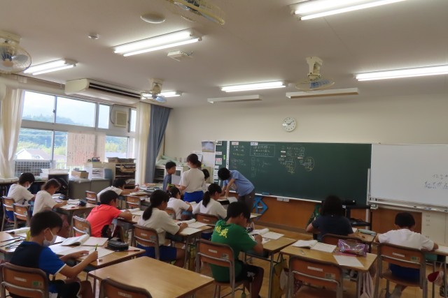 小数のわり算の練習問題をどんどんレベルアップしながら進めていました。先生に○をつけてもらい、児童からは「なんでまちがえてしまったのかなあ」という声が聞こえてきます。美九里西小の児童は「間違いから学ぶこと」がとてもよくできます。目標をもって学習し、達成したい!という「やる気いっぱい」だからこそ、こうやって頑張っています。そして頑張る児童を見ていると先生も優しく応援したくなります。