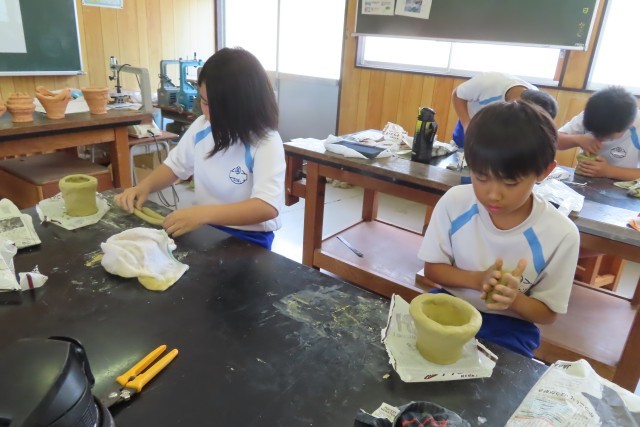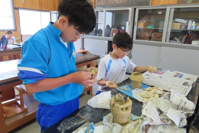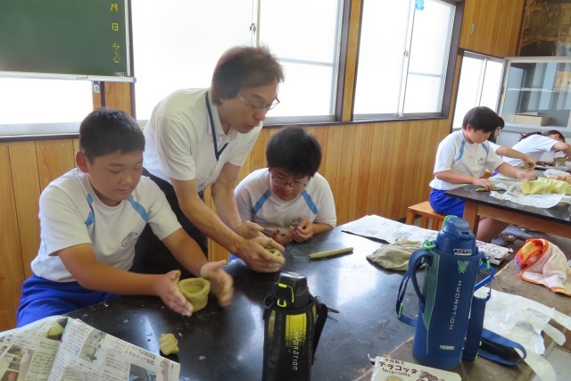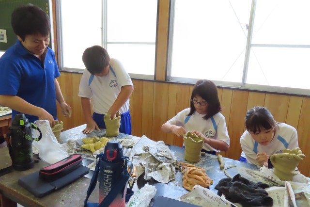 講師の方に教えていただきながら土器作りに夢中です。昨日、歴史館見学、七輿山古墳、伊勢塚古墳で藤岡の歴史を学んできたばかりです。気持ちはその時代にタイムスリップしながら真剣に作っていました。粘土は乾燥しやすいので、濡れたタオルをうまく使いながら作ったり、様々な道具を工夫しながら飾りをつけたりしていました。このあと完成品が手元に届くまで時間がかかりますが、仕上がりが楽しみです。
