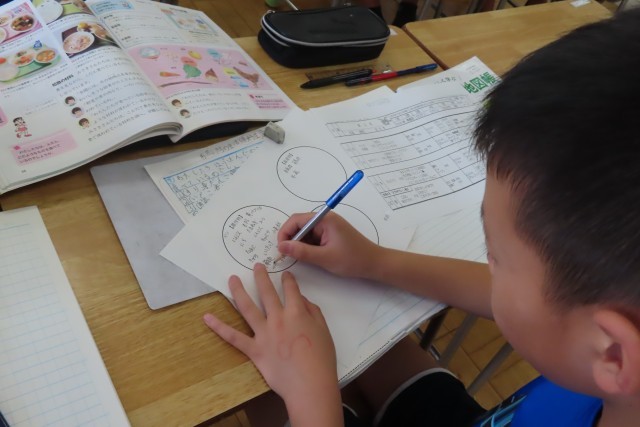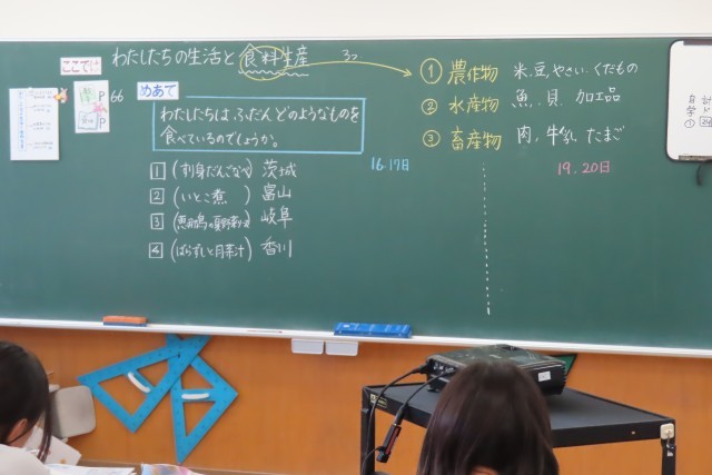 「わたしたちの生活と食料生産」の学習に入りました。「ここでは」日頃食べている食べ物の産地のこと、それをつくる人々の工夫や努力と私達消費者とのつながり、さらには食料生産における課題等、生活と大きく関わりのあるテーマについて調べ学んでいきます。今日は先日の給食献立表を見て、給食で使われている材料を調べて分類していました。自分の体をつくっているものをこうして丁寧にみることで、どこでどのようにつくられて、運ばれてきているのか?知りたい!と関心が高まっています。