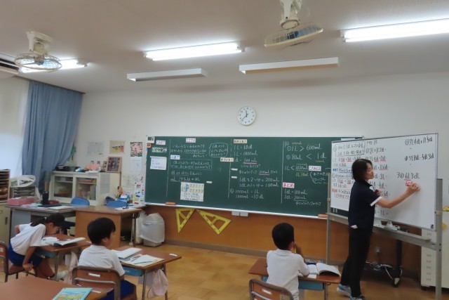 2時間目に算数、そのあと体育をはさんで4時間目も算数でした。4時間目の算数では、なんと!かさの計算ができるようになっていました。どんどん問題にチャレンジしていました。2時間目に学習したことが黒板に残っていたので、それをヒントにして問題を解きました。2時間目に「わかった!」「きづいた!」を思い出しながら、本当に一生懸命一問一問考えていました。感心しました!今日の算数も「やる気いっぱい」100点満点です!