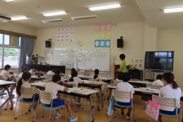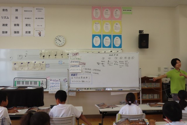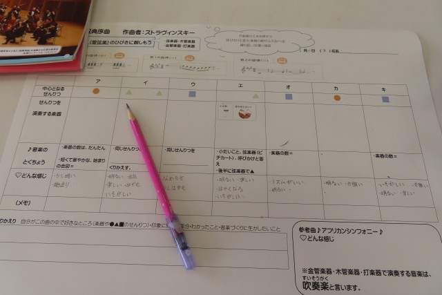 「祝典序曲」オーケストラの演奏を聴いて、それぞれの場面でどんな感じがするのか?みんなで意見を出し合っているところでした。「ここでは」オーケストラ(管弦楽)において音色の異なるたくさんの楽器が一体となって生み出す豊かな響きをたっぷり味わいます。特に、主旋律を演奏する楽器に着目するなどしてこの曲や演奏の素晴らしさをたくさん感じ取っていきます。