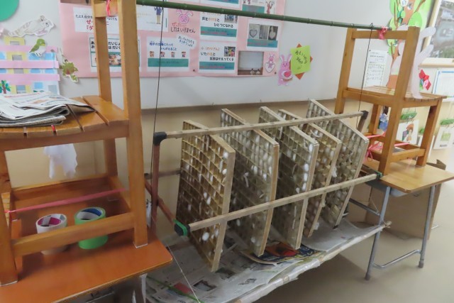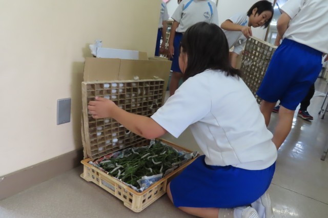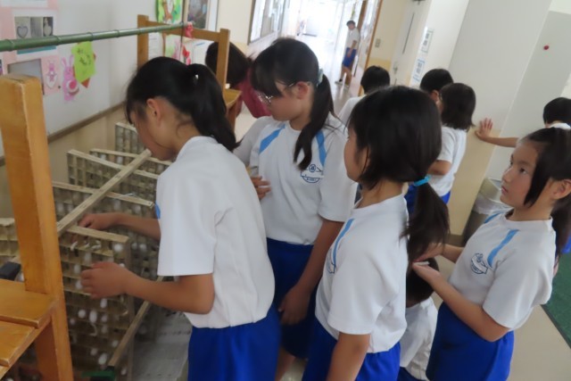 4年生はカイコを大切に育てています。週末になるとカイコたちは4年生児童の家庭、担任の家で過ごしており、毎週、月曜になると金曜日に見た姿より驚くほど成長して、目を疑うほどでした。今日はなんと!いよいよマユをつくり始めていました。4年生は、カイコがマユをつくるのに困らないように丁寧に環境を整えています。また明日の朝にはどんな様子になっているのか、登校が楽しみですね。