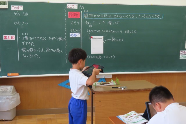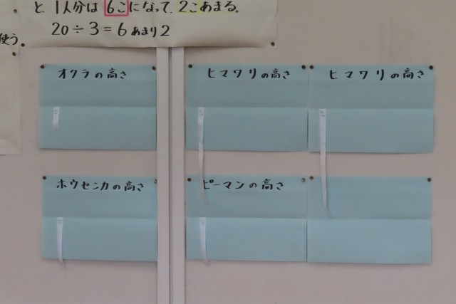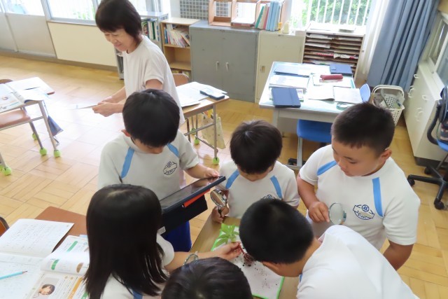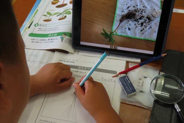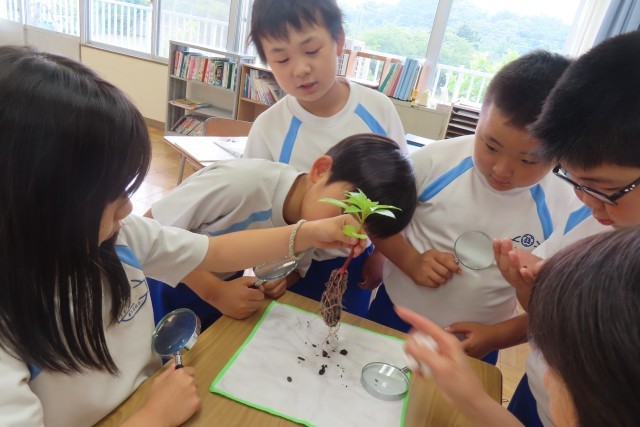 「どれぐらい育ったかな?」植物のからだのつくりを調べ学習中です。3年生は大好きな虫だけではなく、植物にも夢中になって学習しています。今日はホウセンカを土の中から取りだして観察していました。みんなの予想は「ねっこ、くき、葉っぱ」さあどうだったでしょうか?他にもオクラ、ヒマワリ、ピーマンも観察しているようです。3年生の理科ではこうして、1種類だけでなくて複数の植物を観察して、違いや共通点などを見付けて学んでいきます。