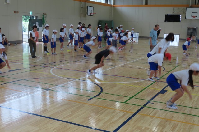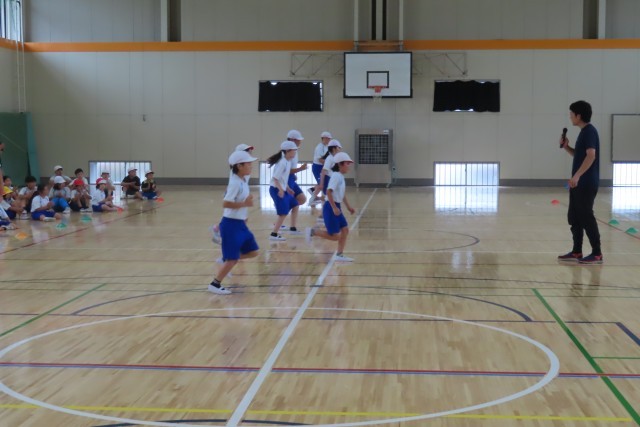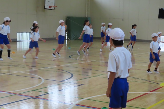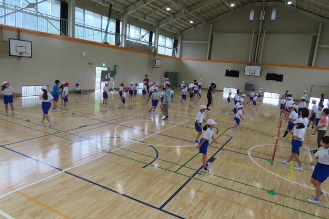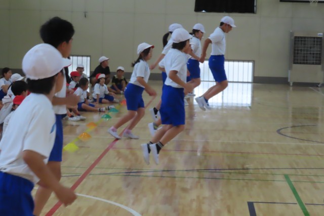 前回はじめて挑戦したラインジャンプが楽しかったので、今朝はこの体育集会をとても楽しみにして登校した児童です。今日はさらにレベルアップしたやり方を、体育委員の児童が考えて提案しました。4~6年生までそれぞれが3パターン提案し、今日もノリノリのカッコいい音楽にあわせてみんなで楽しく汗を流しました。こうやって友達と楽しく仲良く体を動かして素敵な時間を過ごせるのが美九里西小学校の自慢です♪また次回の体育集会も楽しみです。