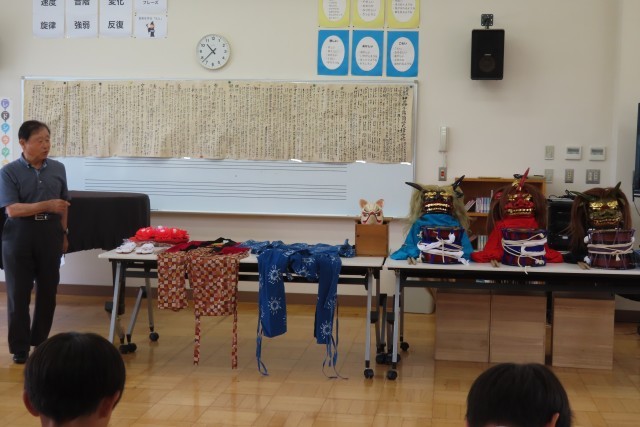 6年生は総合的な学習の時間で、地域の歴史や文化について調べ、学習を進めています。今日は、神田獅子舞保存会の皆様にご来校いただき、地域の大切な伝統文化である神田獅子舞について実際にお話をうかがったり、体験させていただいたりすることができました。大変貴重な時間でした。獅子舞について学習し、疑問に思ったことやもっと知りたいことを事前にお知らせしておいたのですが、そのことについてとても丁寧に分かりやすくご回答いただきました。