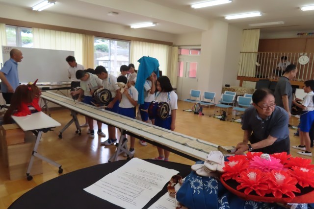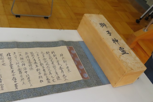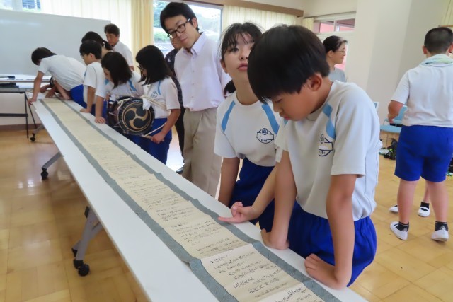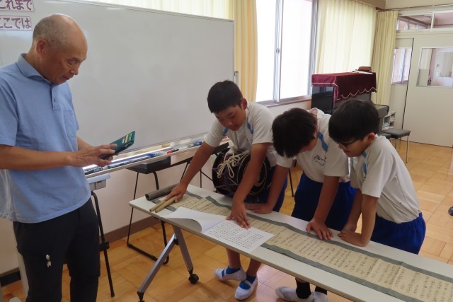 江戸時代前期から伝わるこの神田獅子舞の由来が書かれた貴重な巻物も見せていただきました。読み取ることはできませんが、所々に「獅子」「笛」など知っている言葉が見られて6年生は嬉しそうでした。大切に保管している貴重なものを児童のためにご持参いただき、本当にありがとうございました。