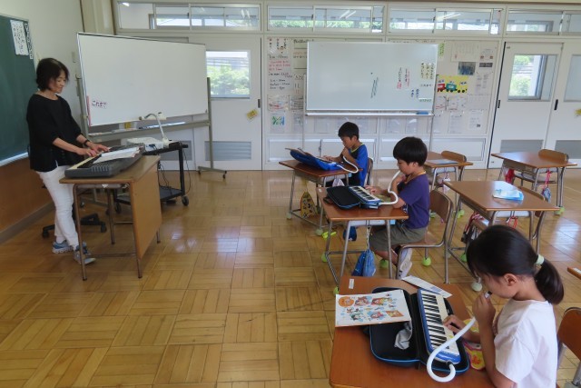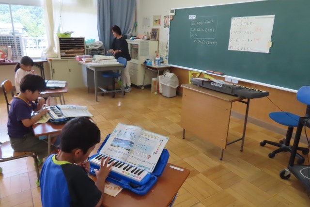 今日は1年生が水泳学習なので、2年生だけで音楽の学習を楽しんでいました。ちょっと寂しい気持ちもありますが、3人で楽しく鍵盤ハーモニカの演奏をしていました。「かえるのがっしょう」ではおいかけっこしながらみんなで演奏を楽しみました。また新しい曲「ぷっかりくじら」は先生が驚くほど上達がはやくて、演奏しながら楽しい気分で体が自然と動くほどでした。また先生からは今日のめあて「指使い」「タンギング」が上手にできたことをほめてもらっていました。