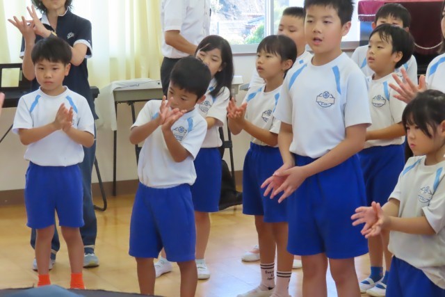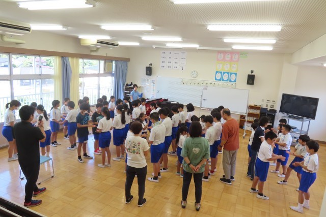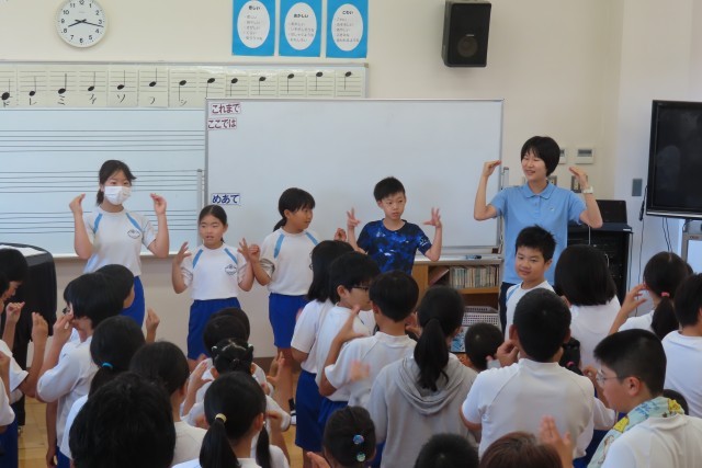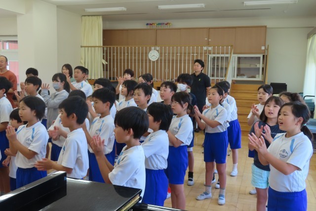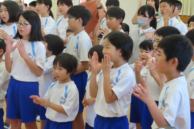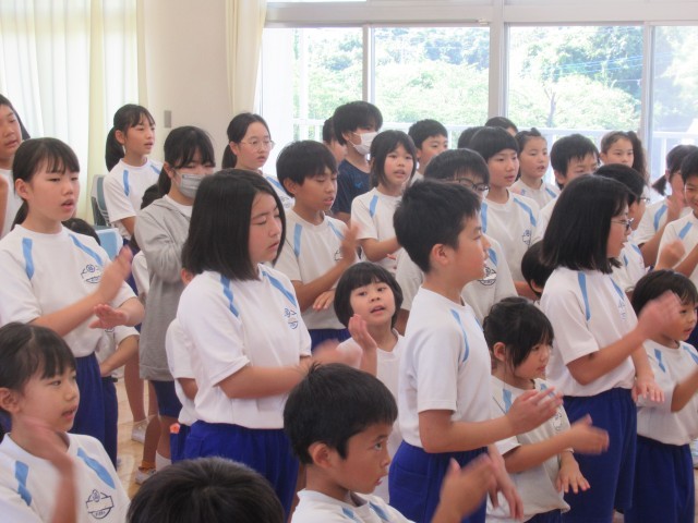 朝から気温上昇のため、冷房の効いた音楽室で楽しく過ごしました。音楽ですこし体をほぐしてから、今月みんなで毎日歌っている人権ソング「ありがとうの花」「Believe」を歌いました。「ありがとうの花」はところどころ手話をつけたり、「Believe」は5年生が下のパートを頑張ったりと、さらにみんなで楽しむことができました。特に「ありがとうの花」の手話つきの合唱は、一人一人の児童のやさしい表現に心が温かくなりちょっぴりジーンとしました。