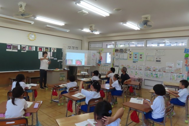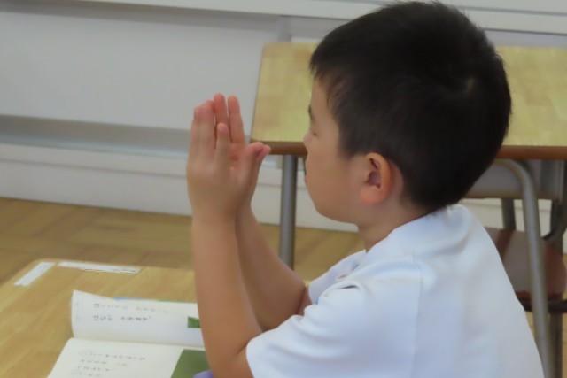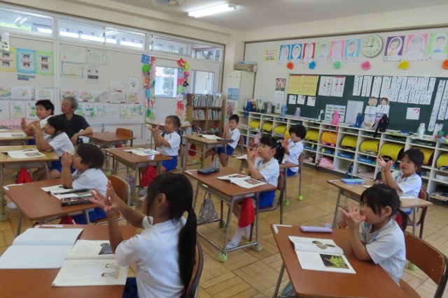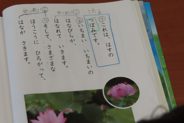 「つぼみ」の学習です。「ここでは」1年生がはじめての説明文と出会います。毎日アサガオを大切に育てている1年生にとってワクワクする学習です。説明文の基本である「問い」「答え」の構成を学びます。教科書に出てくる花の咲く様子を先生と一緒に手で表現しています。