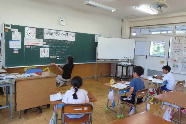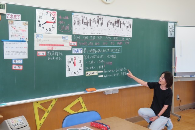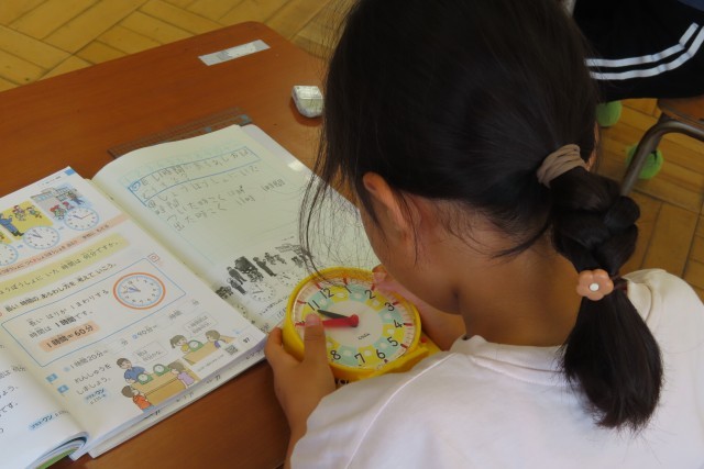 「時こくと時間」の学習です。今日は長い時間の表し方を考えていました。実際に手元の時計を動かしてみると「きづいた!」が出てきました。長いはりがひとまわりすると1時間だ!そして1時間は60分ということもよく分かっていました。先生が「すごいね!」と言うと、児童はやはり生活の中で時計と上手にお付き合いして過ごしているようで、「知っているよ!」と得意げでした。こうやって日々の生活と学習がつながっていることに気付くことで、「ここでは」の学習がさらに充実します。
