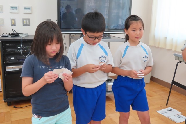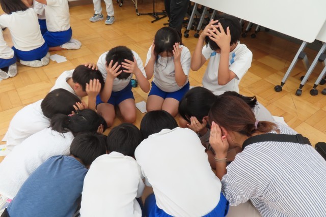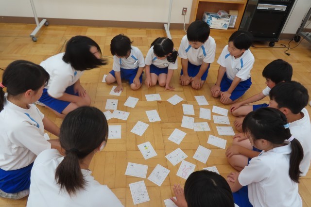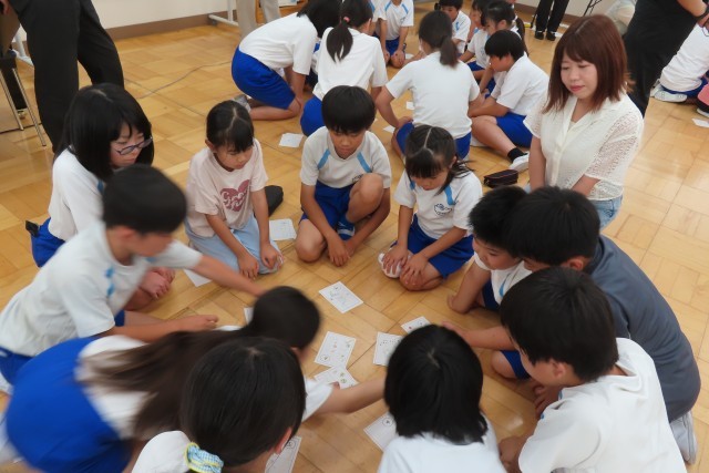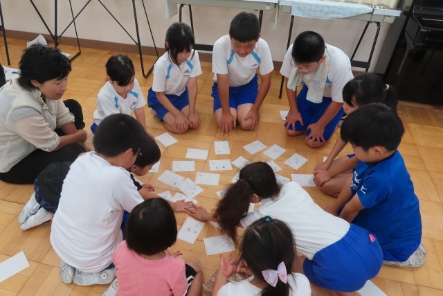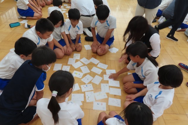 保健委員会では、全校のみんなに意識して生活してほしいことを「かるた」にしました。保健委員会の発表のあと、みんなでそのかるたを楽しみました。縦割り班の仲間やPTA役員の方々と仲良くみんなで楽しみました。あまりにも楽しくてカルタ取りに夢中だったので、後ほどあらためて読みあげられたことをまた確認したいと思います。それにしても保健委員の作成したかるた!100点満点!上出来でした。