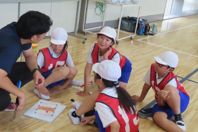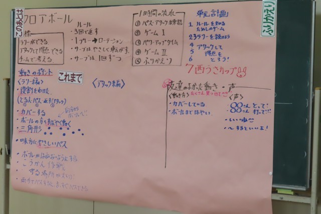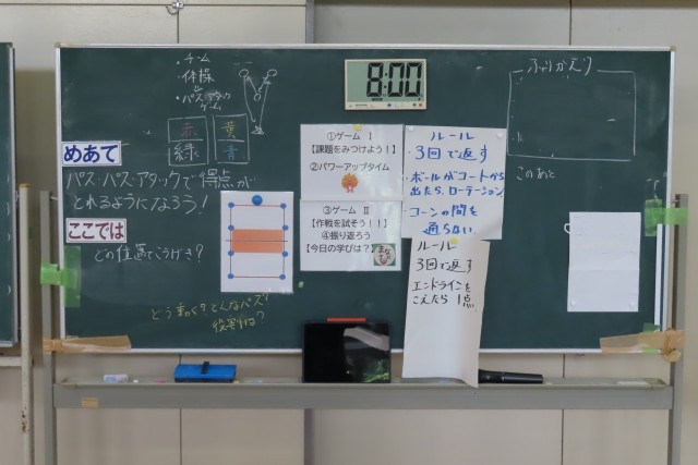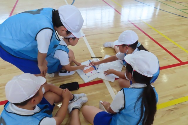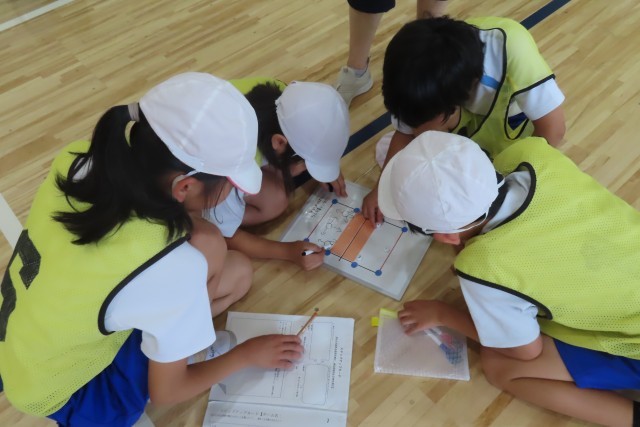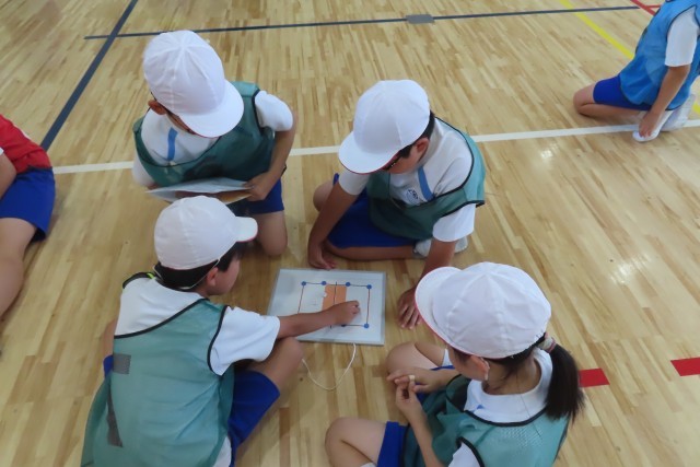 「フロアボール」を楽しんでいます。ただプレーを楽しむだけではなく、「ここでは」チームの一人一人に役割があること、作戦を考えてプレーすることを楽しんでいます。体育館では、こまめに水分補給をしながら、みんなで頭をつかって、チームワークの協力体制を発揮しながら作戦会議中でした。ホワイトボード上でマグネットを動かしたり、ワークシートに記録したりするなど動き方を想像しながら真剣でした。勝ちたい!というやる気いっぱいで頑張りますが、勝敗を超えて得るものは素晴らしいものだと思います。