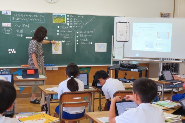 「高い土地のくらし」の学習では、嬬恋村のキャベツ作り等を例にあげ、高い土地に住む人々のくらしや産業について調べます。今日はどうして嬬恋村ではキャベツ作りが盛んなのか?いくつかの資料の読み取りとつなげて考えていました。友達の考え(タブレット上)もヒントになります。感心したのは、振り返りで、「これまで」学習した低い土地のくらし(海津市)のときの学習内容を思い出して比較して考え始めた児童がいたことです。5年生は学習がどんどんつながっていき、深まっていくんだと感心しました。