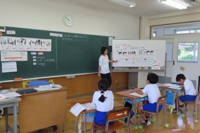 「時こくと時間」の学習です。今日は教科書のりくさんの一日のスケジュールを見て、りくさんが起きていた時間は?考えました。まず、起きた時刻はわかるけど・・・起きていた時間って?ちょっと悩んでいました。そしてやっとたどり着いた就寝時刻は9時。6時に起きて9時?これは、昨日、午前と午後を使って言うことの大切さを学んだばかりなのでバッチリでした。