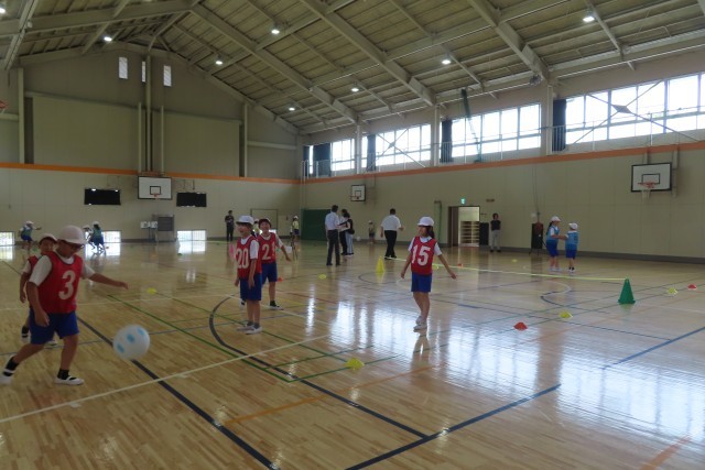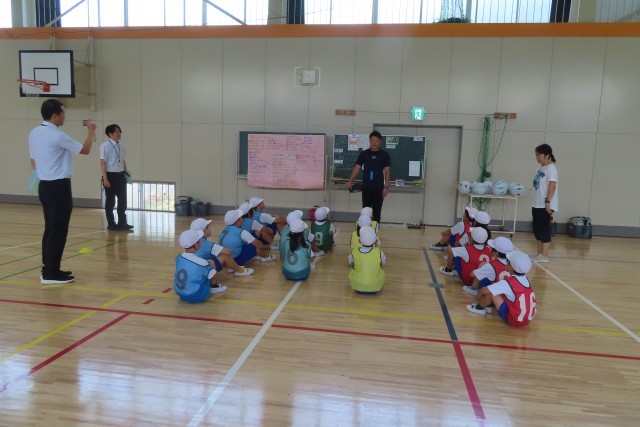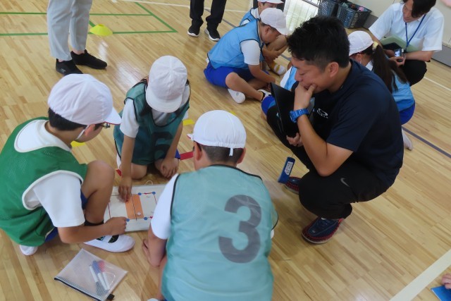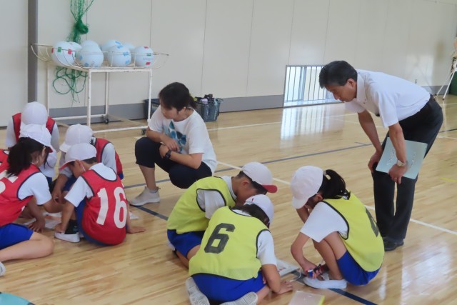 3・4年生の体育「フロアボール(ネット型ゲーム)」です。だんだんといろいろな技術が身に付いてきて、チームで作戦をたててプレーすることの必要性が出てきました。先生から指示がなくても「チームの仲間と考えたい!」というやる気いっぱいな素晴らしいチームワークを発揮しています。「パワーアップタイム」と名付けてみんなで頭を悩ませは動いてみて、を繰り返しながら仲間とプレーすることの楽しさ、運動することの楽しさをたくさん味わっています。