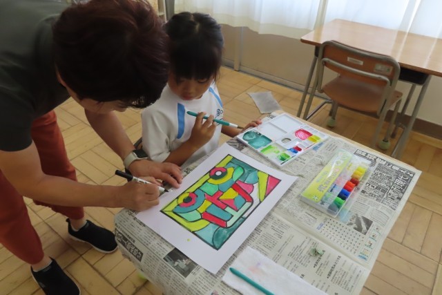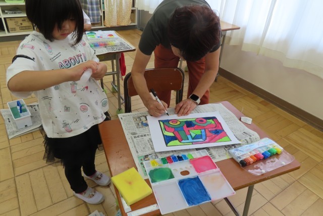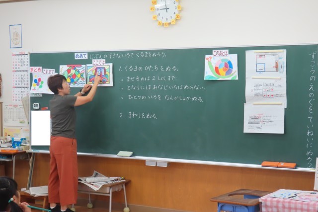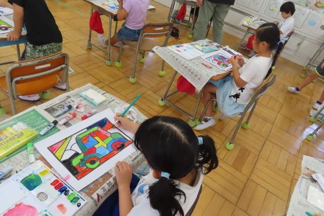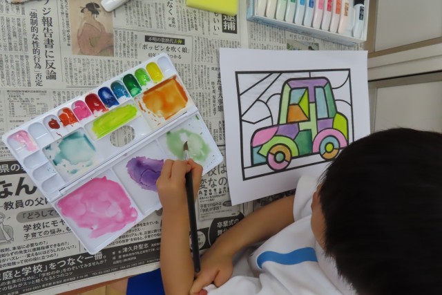 「えのぐであそぼう」絵の具を使って上手にいろいろな色を作って表現できるようになっています。先週は「おさかな」今日は「くるま」です。私がとても感心(感動)したのは、1年生がお互いに色の作り方や塗り方などを見て学び合っているところです。(写真上)のように「○○ちゃん、きれいないろだね」「とっても じょうずだね」と友達に優しく言葉を届ける姿が見られます。素敵です!先生もそんな優しい学び合いの姿を見て、とても嬉しそうでした。