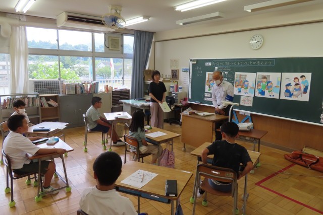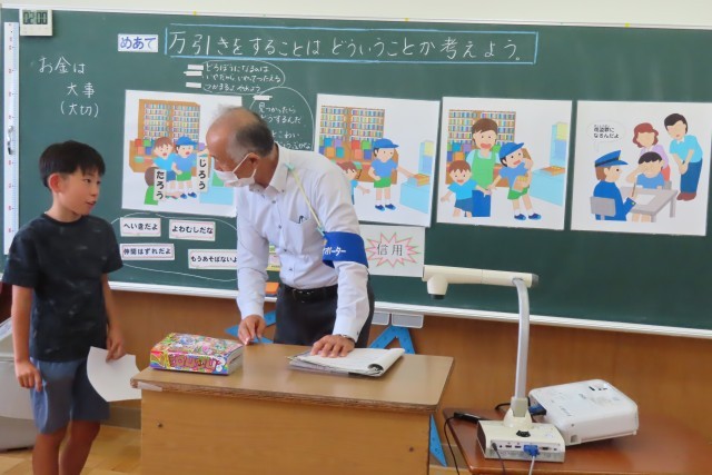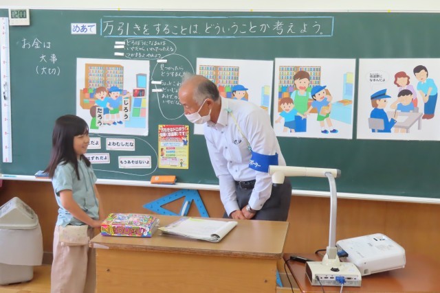 本日3時間目、藤岡警察署の方にご来校いただき、3年生児童を対象とした「万引き防止教室」を実施しました。初めて聴くこと、初めて知ることばかりで驚いていた様子が見られましたが、とても大切なことを教えていただきました。万引きは犯罪であること、信用を失うことなど、よく考えることができました。また、法律やルール、誰かを傷つけたり悲しい思いをさせたりすることは絶対に「ダメ!」断る勇気をもつことの大切さも考えました。