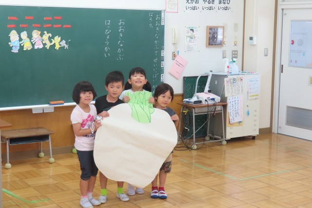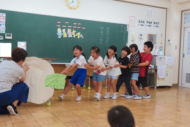 今日はいよいよ「おおきなかぶ はっぴょうかい」の時を迎えました。学校で家で、何十回も声に出して読んできたお話なので、まるで1年生がつくったお話かと思うくらい上手でした。元気よく、役になりきって本当に上手にできて大きな拍手を贈りました。あまりにも上手で、見ている私も「うんとこしょ!」どっこいしょ!」一緒に汗をかきながら、大きなかぶを抜いているような気持ちで、「がんばれ!」と応援していました。今日は1人2役で頑張った子もいました。最後に、先生からとてもほめてもらって「笑顔いっぱい」な1年生です。