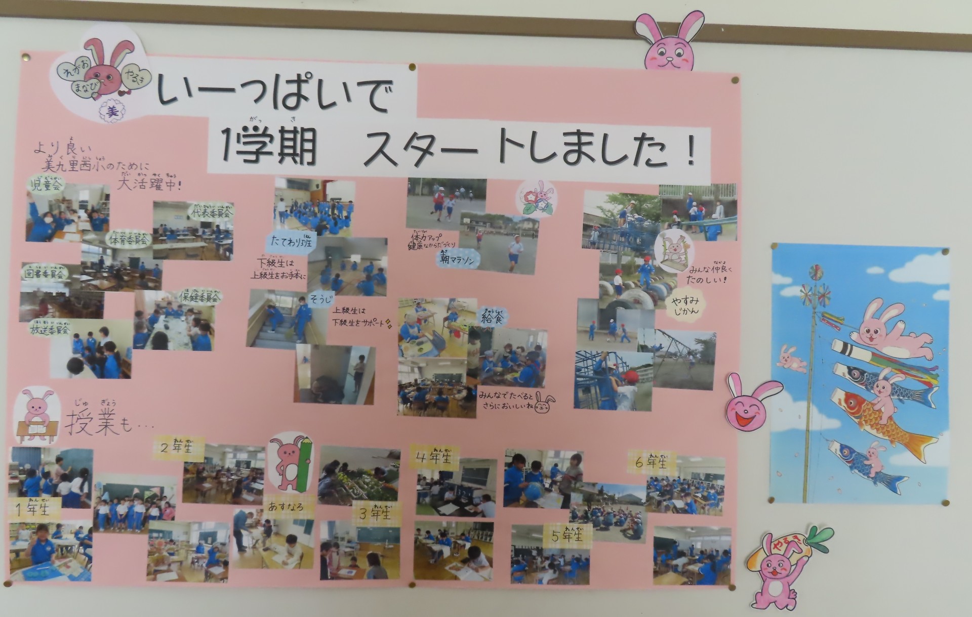 みんな大好き西うさぴょんが掲示板に新しい掲示物をつくってくれました。「学びいっぱい・笑顔いっぱい・やる気いっぱい で1学期をスタートしたね!」児童の頑張り、前向きなスタートを応援してくれています。みん...