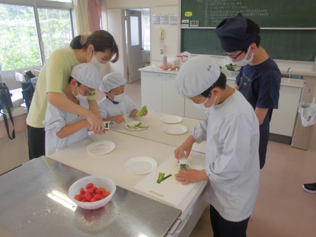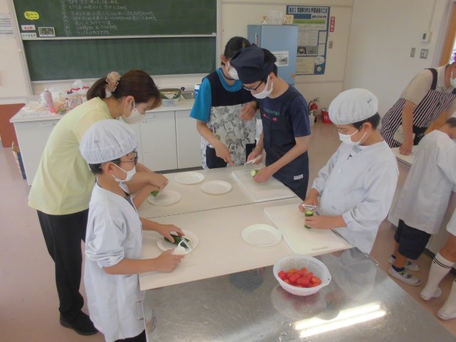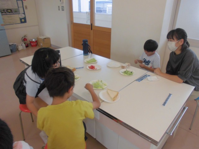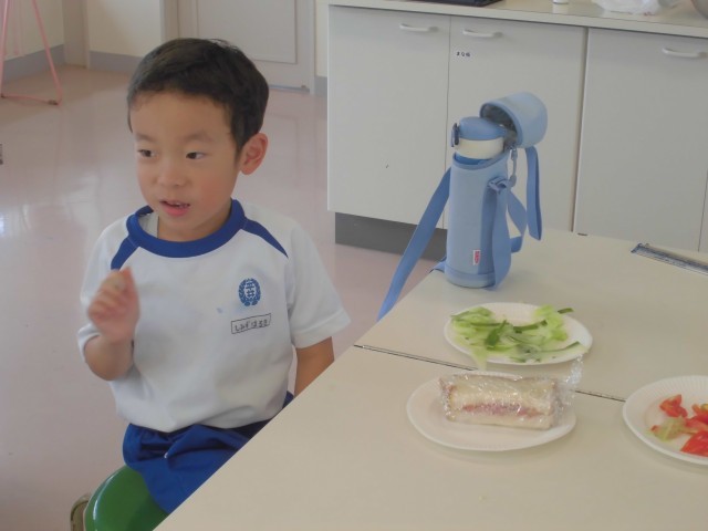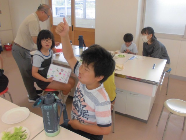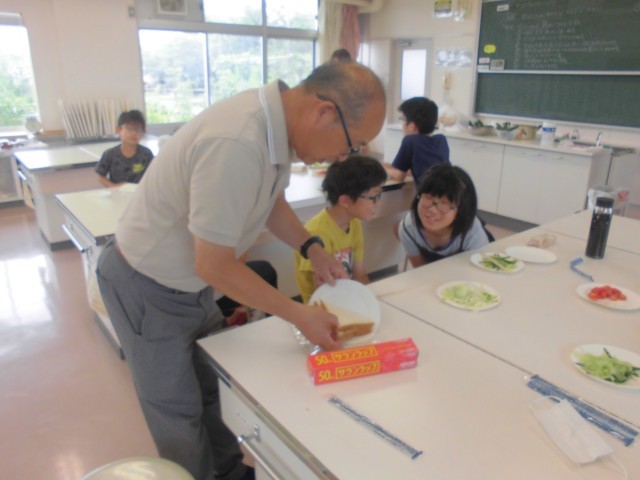 日野小との合同交流会です。収穫できた野菜をサンドしたサンドイッチをみんなで調理して、楽しく・美味しくいただきました。