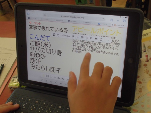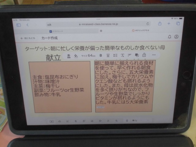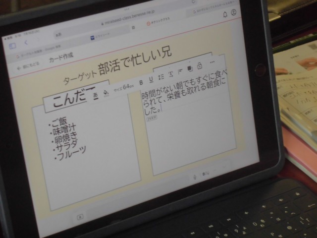 家族の誰か(ターゲット)に合わせ、一食分の献立を考えます。タイトルが泣かせますね。