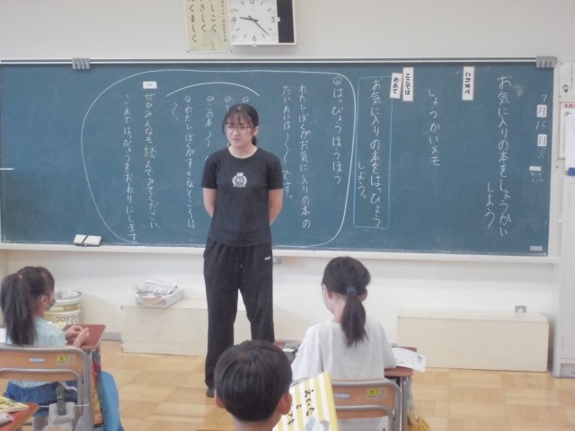 お気に入りの本を紹介します。友だちの発表は、みんな静かに聞きます。