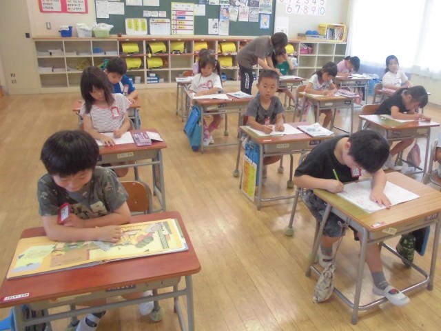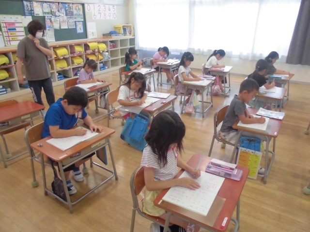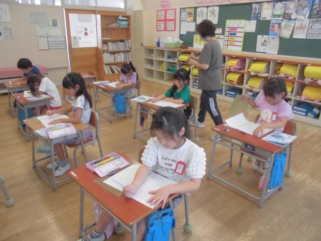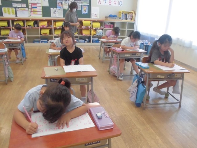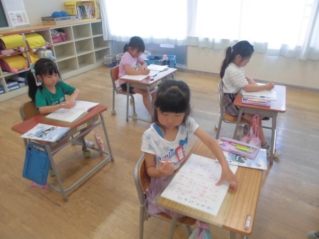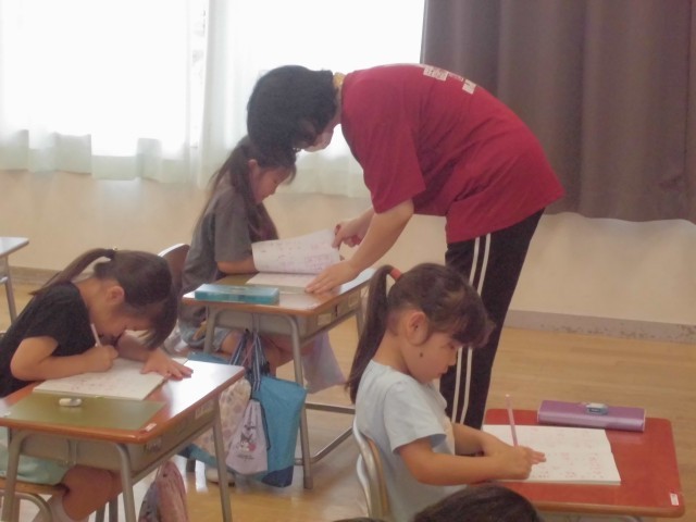 先生がノートに赤い字で書いたお手本をなぞって、きれいなバランスのよい字を練習します。