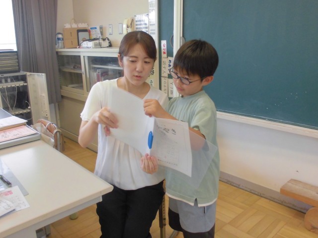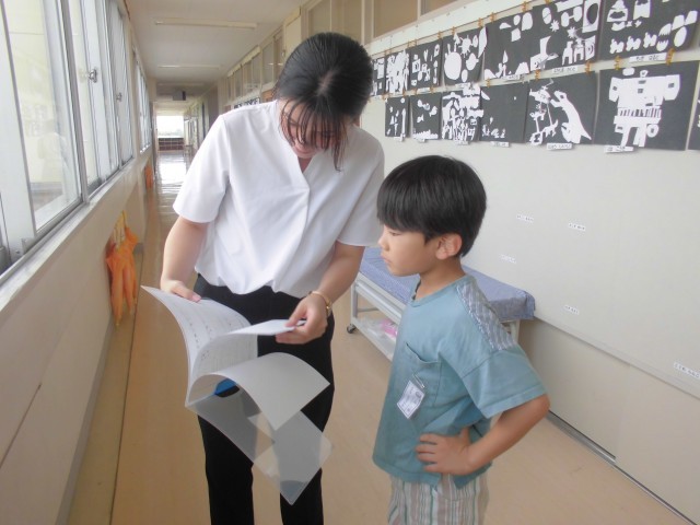 担任がアドバイスしながら、一人一人ていねいに手渡していきます。