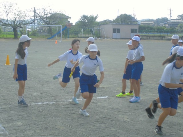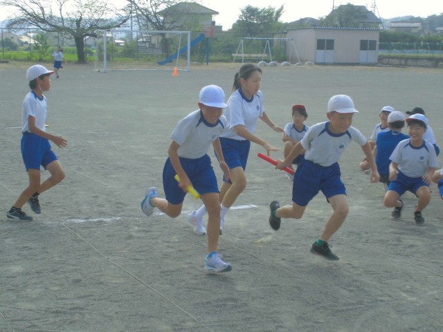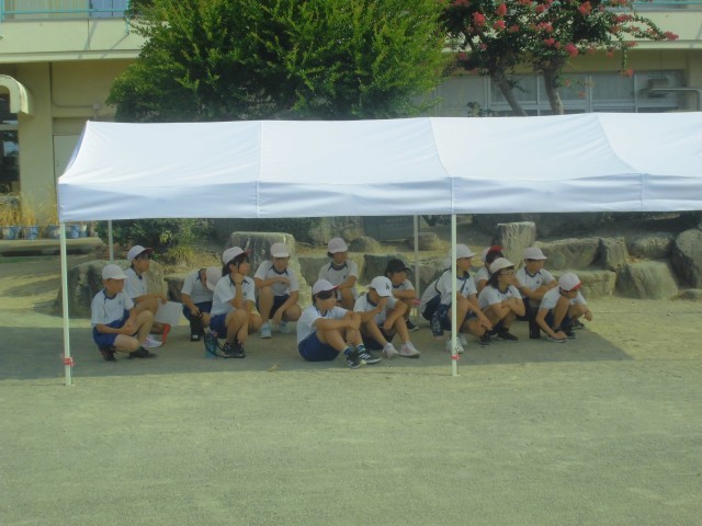 朝早いうちに、校庭で団ごとのリレーの練習です。暑さ対策のテントもしっかりと利用します。