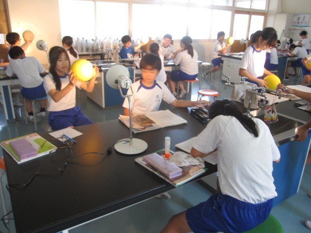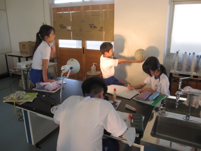 ボールに光を当てて、月の見え方を調べました。