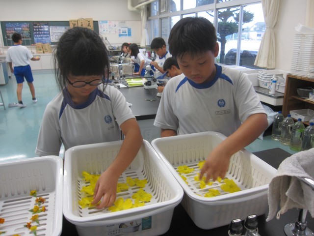 植物の種類によって、花粉の形や大きさがちがっていました。どちらの花粉も昆虫やめしべにつきやすいように、ねばねばしていたり、とげのようなものがついていたりすることがわかりました。
