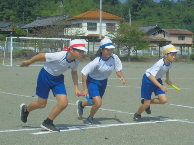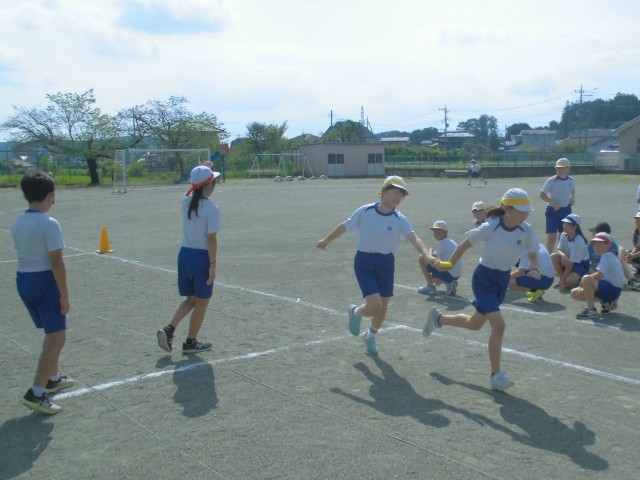外が暑いので、体育館でバトンパス練習をして、校庭で一回本番同様にリレーを走ります。