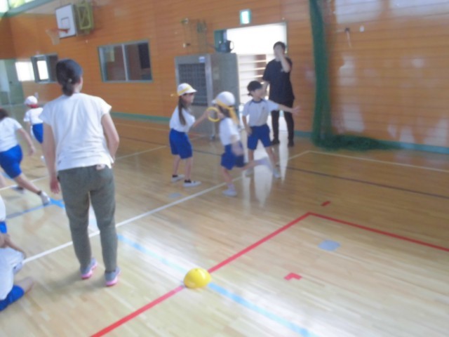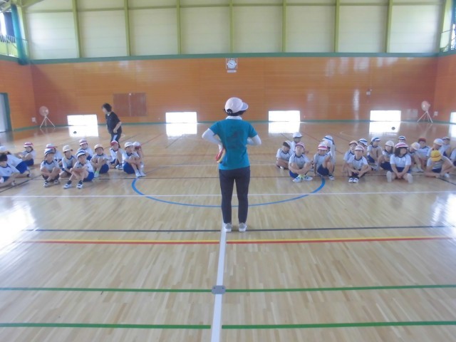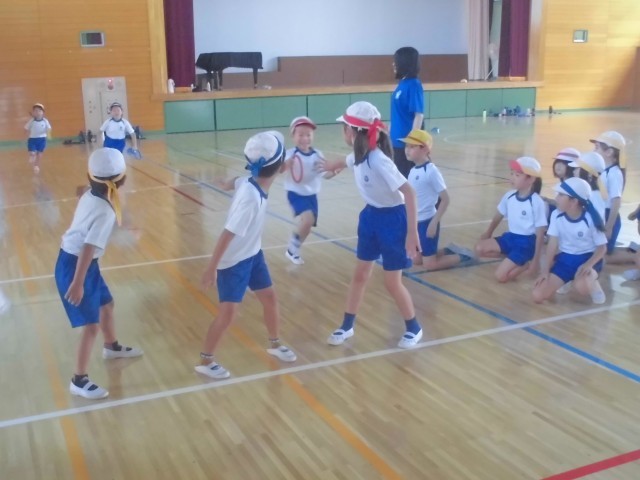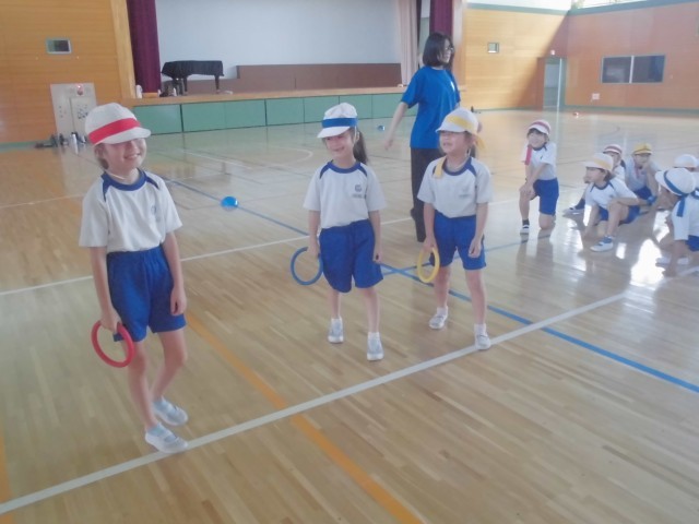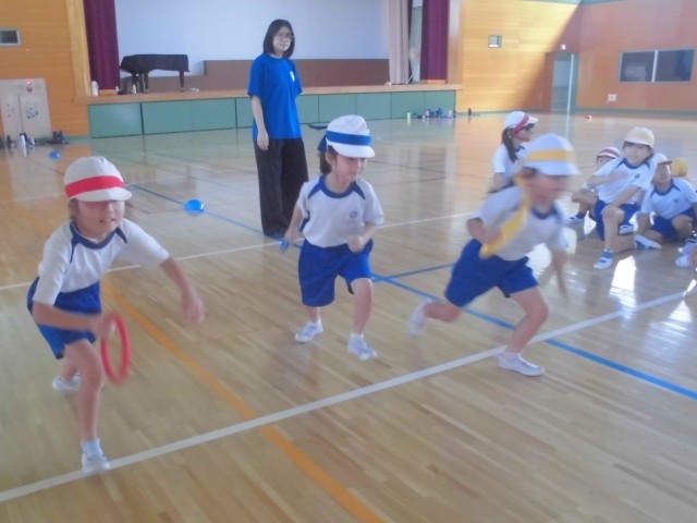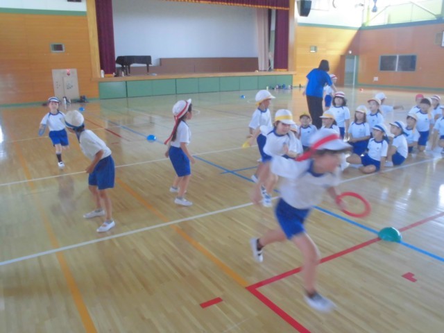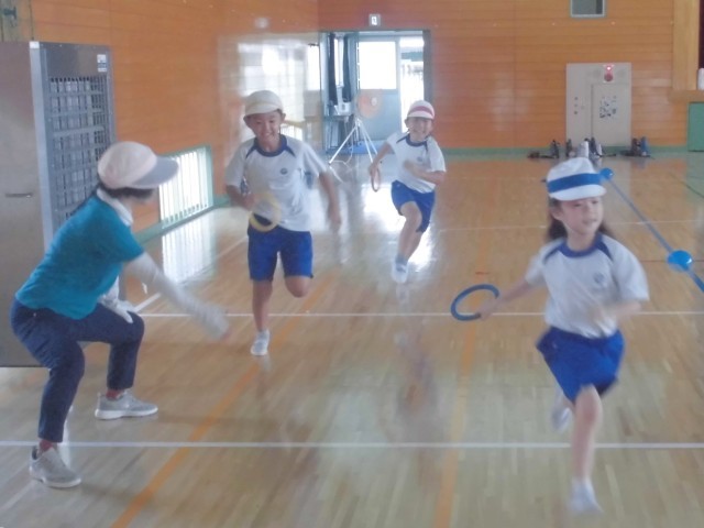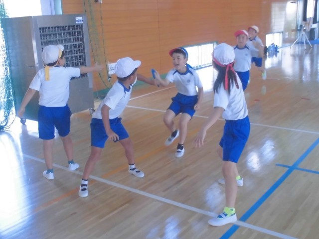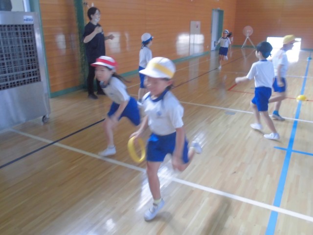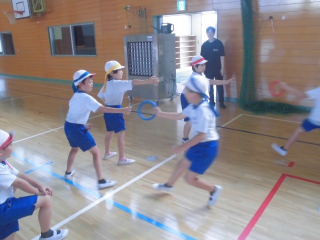 外が暑いので、体育館でリレーの練習です。低学年はリング状のバトンをつかいます。