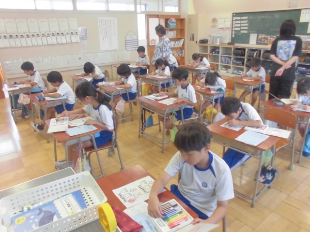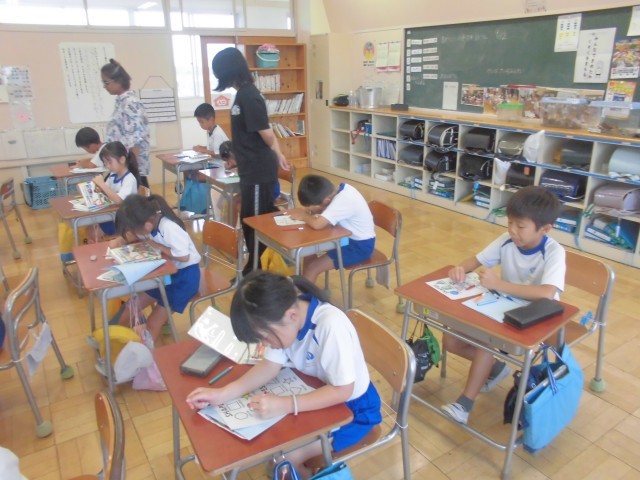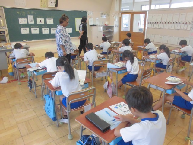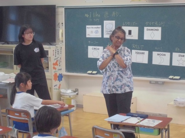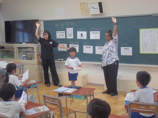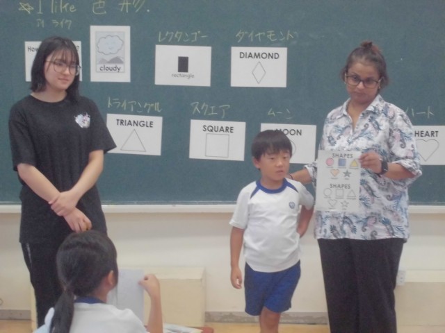 いろいろな形をいろいろな色で塗り、それを英語で表現し合います。