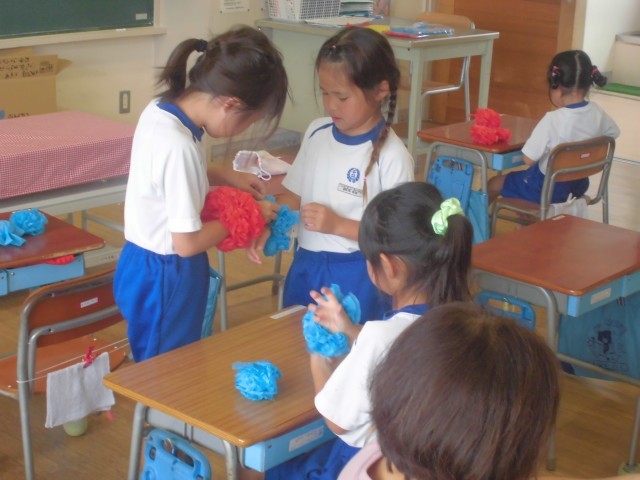 運動会のダンスでの手首飾りでしょうか。みんなで協力しながら、楽しそうに制作しています。