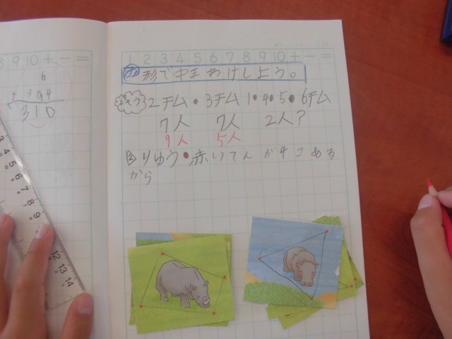 図形の学習に入ります。杭を直線で結んで動物を囲みながら、図形の特徴を考えます。