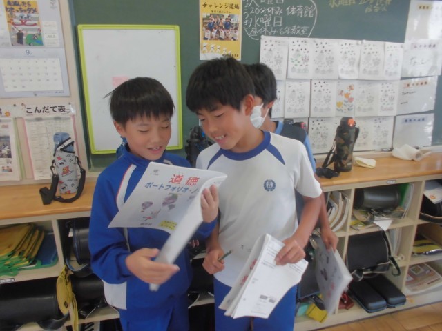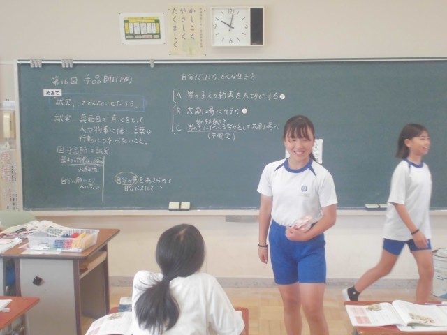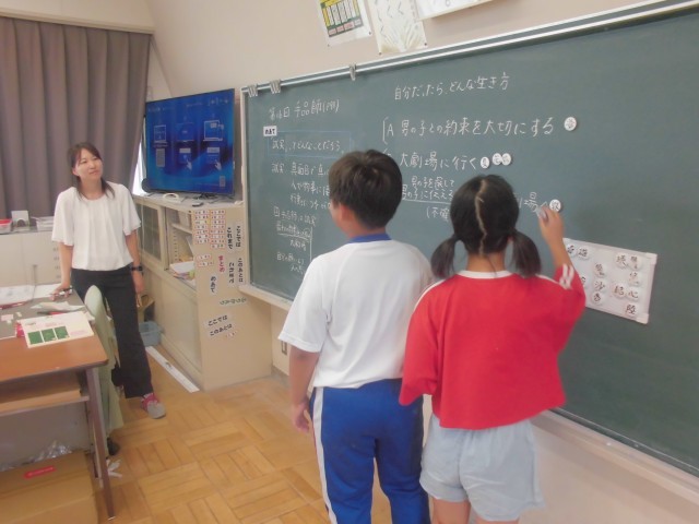9月30日(火)5年生 道徳 公開日 2025/09/30 更新日 2025/09/30 できごと 異なる3つの立場が提示され、自分はどの立場にするかを決めて、ネームプレートで意思を示し、教室後方で意見交流します。 +4
